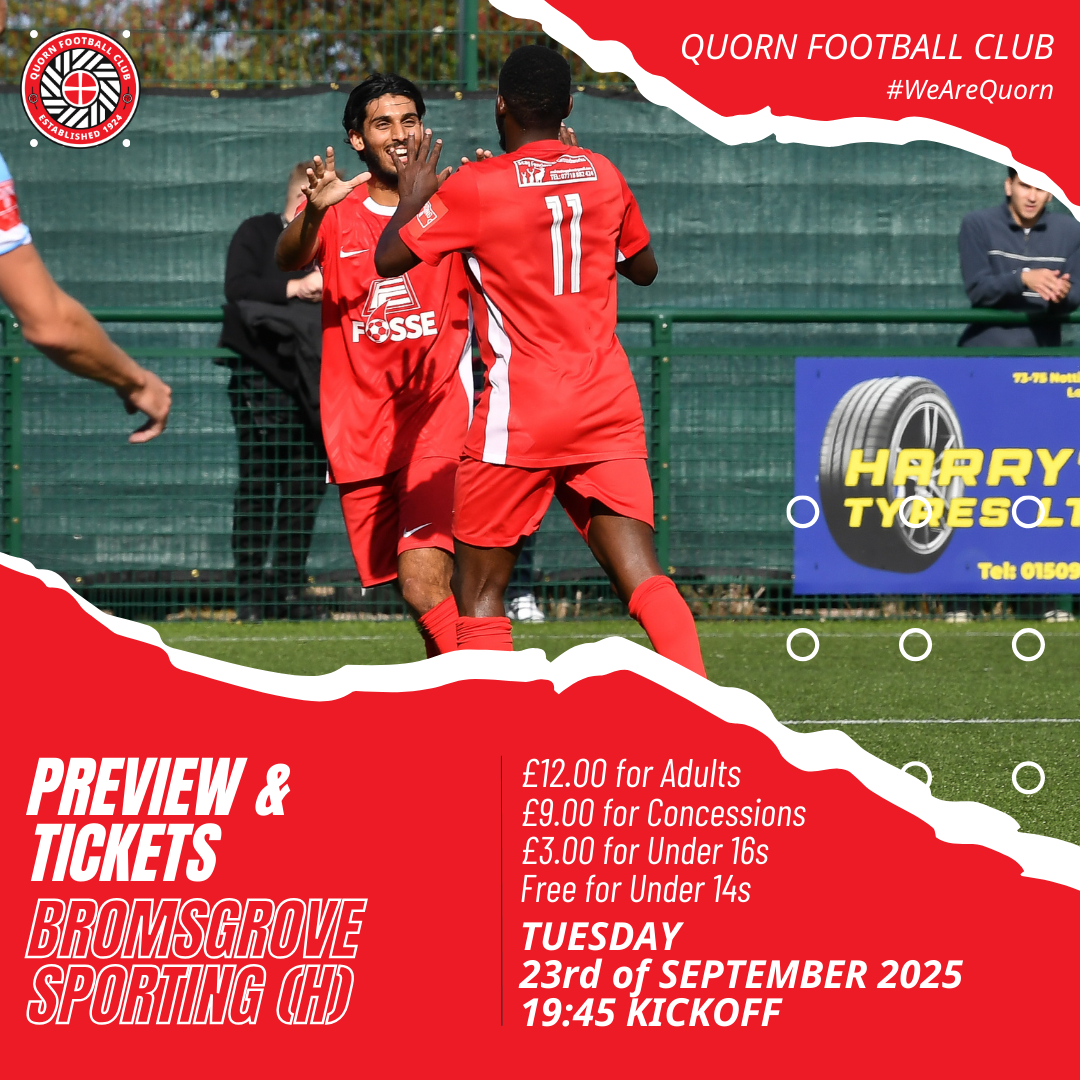 Quorn won’t have too long to dwell on the weekend defeat at home to Royston Town, as Bromsgrove Sporting visit the Stotto on Tuesday evening.